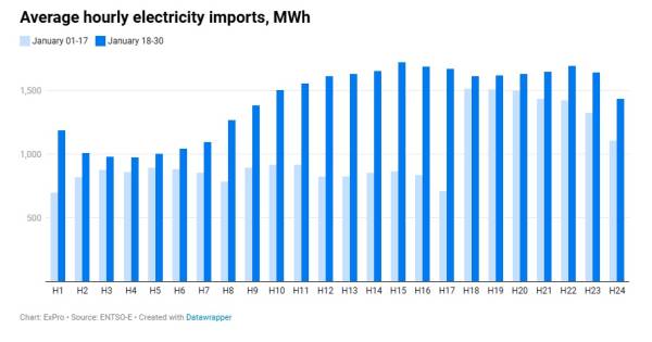 "За підрахунками ExPro, середньодобовий імпорт за даний період зріс на 41% (порівняння за 1-17 січня 2026 року та 18-30 січня 2026 року) – до 33,9 тис. МВт-год. Крім того, в січні було зафіксовано рекордне значення імпорту за добу – 41,9 тис. МВт-год.", – зазначено у повідомленні.