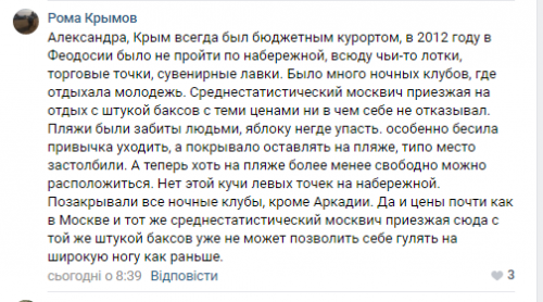 12. На паблике Феодосии начинают подводить итоги несезона: “Крым всегда был бюджетным курортом. В 2012 году в Феодосии было не пройти по набережной: всюду чьи-то лотки, торговые точки, сувенирные лавки. Было много ночных клубов, где отдыхала молодежь. Среднестатистический москвич приезжая на отдых с штукой баксов с теми ценами — ни в чем себе не отказывал. Пляжи были забиты людьми, яблоку негде упасть. Особенно бесила привычка уходить, а покрывало оставлять на пляже — типа место застолбили. А теперь хоть на пляже более-менее свободно можно расположиться. Нет этой кучи левых точек на набережной. Позакрывали все ночные клубы, кроме Аркадии. Да и цены почти как в Москве, и тот же среднестатистический москвич, приезжая сюда с той же штукой баксов, уже не может позволить себе гулять на широкую ногу, как раньше”.